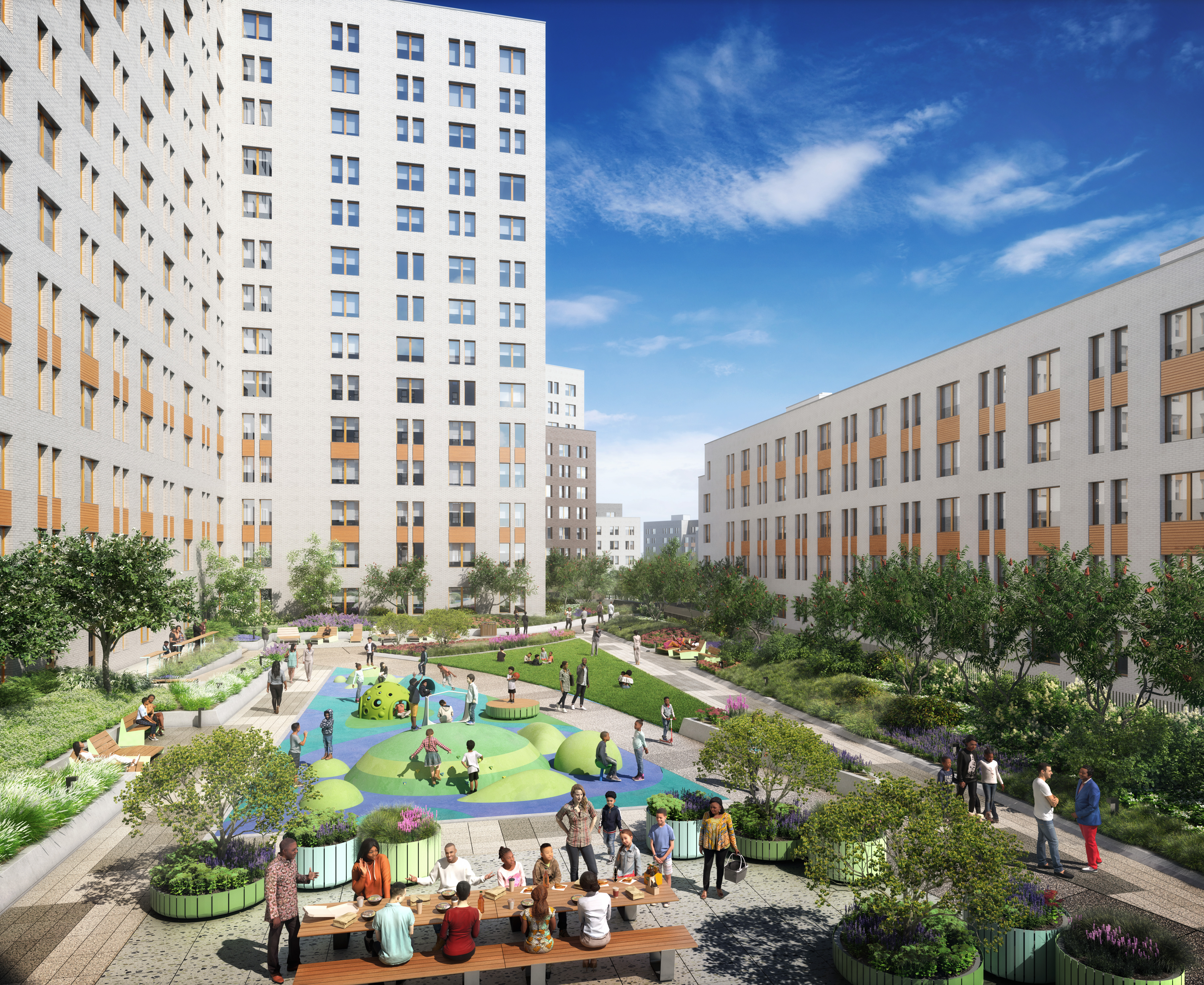 meet Passive House standards and utilize a closed loop geothermal heat pump system and wastewater technology for energy efficient heating and cooling. They are net-zero ready. Additionally, a Maintenance Hub is designed to house the DSNY recycling and trash containers for the whole development including future phases and eventually will host a composting element once the urban farm goes online in a future phase. All aspects of the campus, including new roadways, incorporate sustainable infrastructure to increase resilience, create native planting habitats and reduce stormwater overflow from the site. Phase 1 includes a total of 576 units of affordable and supportive, a clinic, courtyards, walking paths, retail spaces, and a Maintenance Hub. The project has received awards