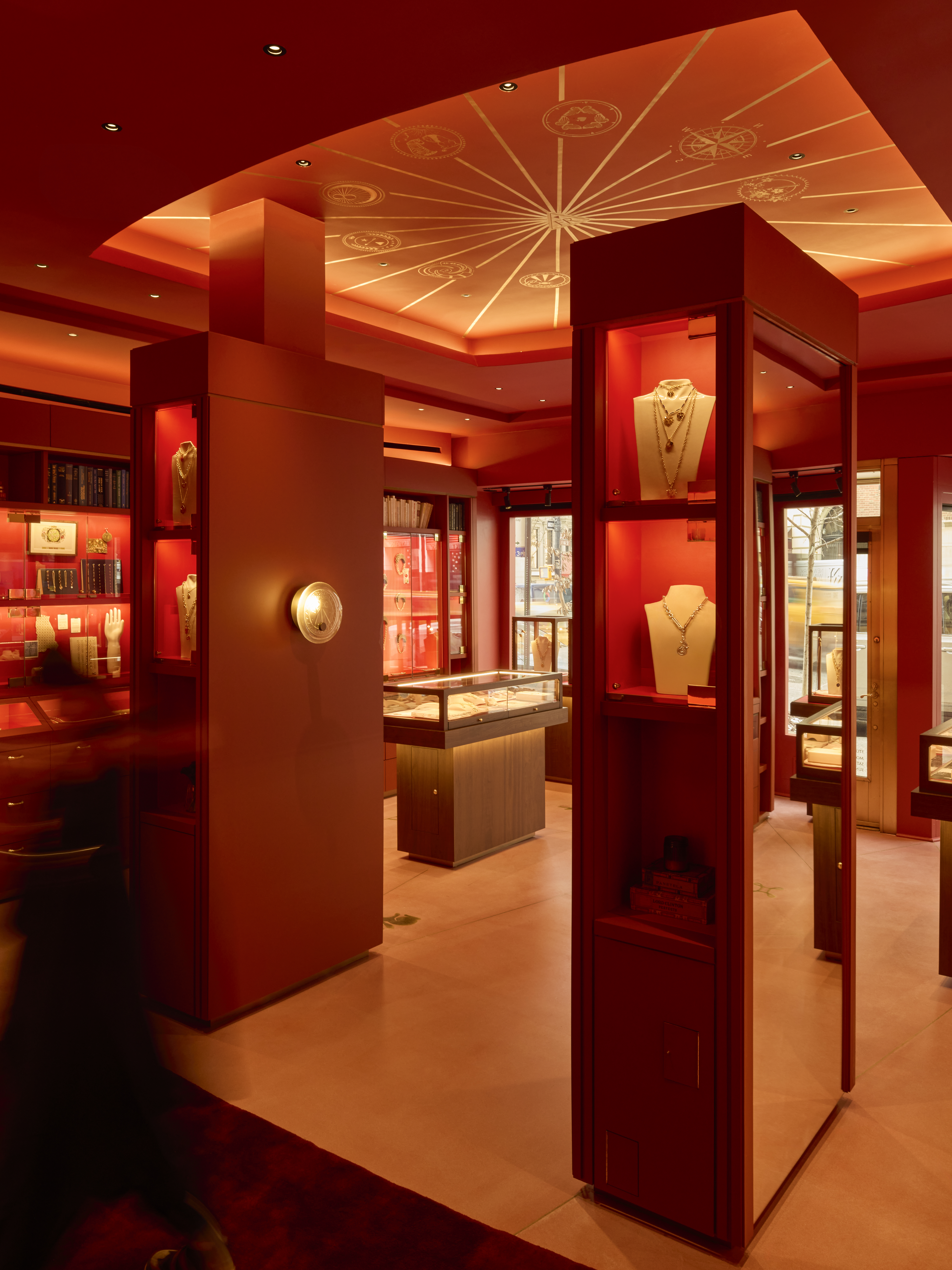 more, feature prominently. Visitors are enveloped in a palette of vivid cinnabar red that coats the walls and lacquered cabinetry. Lighting, designed with Studio Atomic founder Paola Pietrantoni, enhances the jewelry’s brilliance while casting a warm, intimate glow throughout the boutique. The team produced custom sconces featuring FoundRae symbols that would later become available for sale in the homeware section. Brass inlays in the floor and a hand-painted ceiling mural create a richly layered, museum-like atmosphere. Emphasizing a low-embodied carbon and circular design approach, the team preserved existing