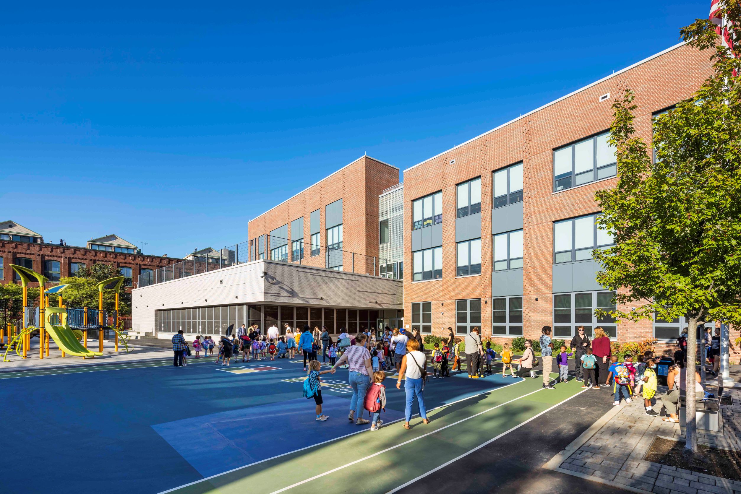 Samuel Mills Sprole School (P.S. 32K) is a tight-knit community long recognized for its neuroinclusive education and strong family involvement. To retire outdated temporary classroom units (TCUs) and unify its growing student population, the 1950s-era H-shaped brick building underwent its first major renovation and addition. With input from the principal and families, and sensitivity to the school’s residential context and well-established identity, the new 3-story, 54,000-SF addition blends seamlessly with the existing building while enhancing its programmatic and spatial qualities. Extending the H-shaped plan’s central corridor eastward, the new wing mirrors the existing layout while introducing contemporary elements. Each corridor terminates in a luminous glass-block wall framing neighborhood views. Three artworks by Letha Wilson, commissioned through NYCDOE’s Public Art for Public Schools program, mark the junction between old and new. Matching brick integrates the addition with the original structure, while modern window detailing and projected brick accents lend it a distinct, expressive character. A new articulated entrance on Union Street features pleated granite panels and a spacious lobby designed to accommodate increased foot traffic. Boldly colored thresholds lead from the lobby into the library, main staircase, and cafeteria, with sweeping 180-degree views onto the playground, creating intuitive wayfinding for families. The daylit main stair connects to upper floors where Pre-K through 1st-grade classrooms are organized into color-coded “neighborhoods.” Above the cafeteria, an Early Childhood Center playground supports cooperative, child-directed play, while a