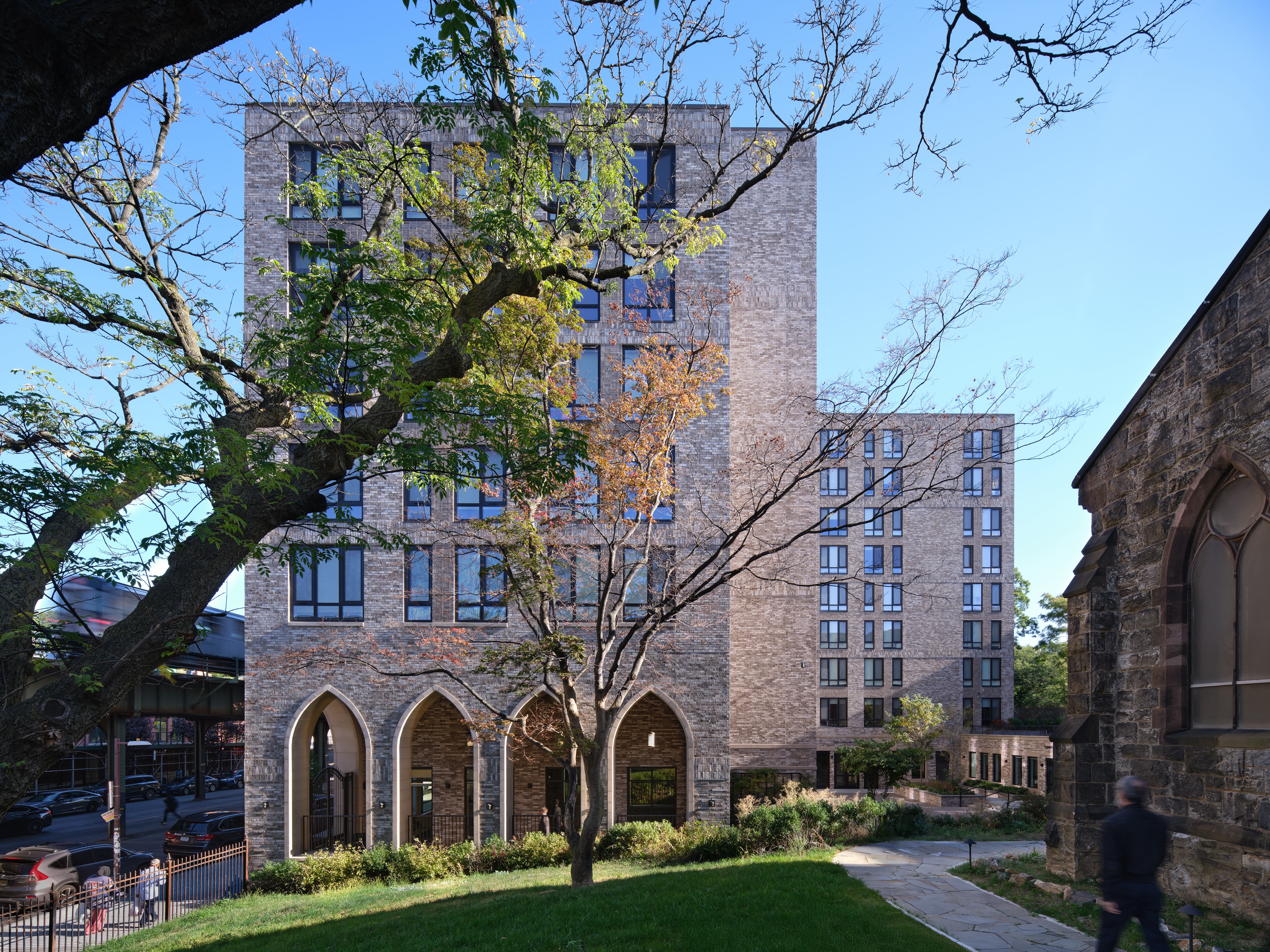 A key design goal was to complement the landmarked Gothic Revival-style church, creating a sophisticated yet subdued backdrop that is deferential to the rugged stone construction, brownstone trim, and stained-glass windows of the historic building. The new building is clad in textured brick with subtle patterns and cast stone details that reference the materiality of the church.
