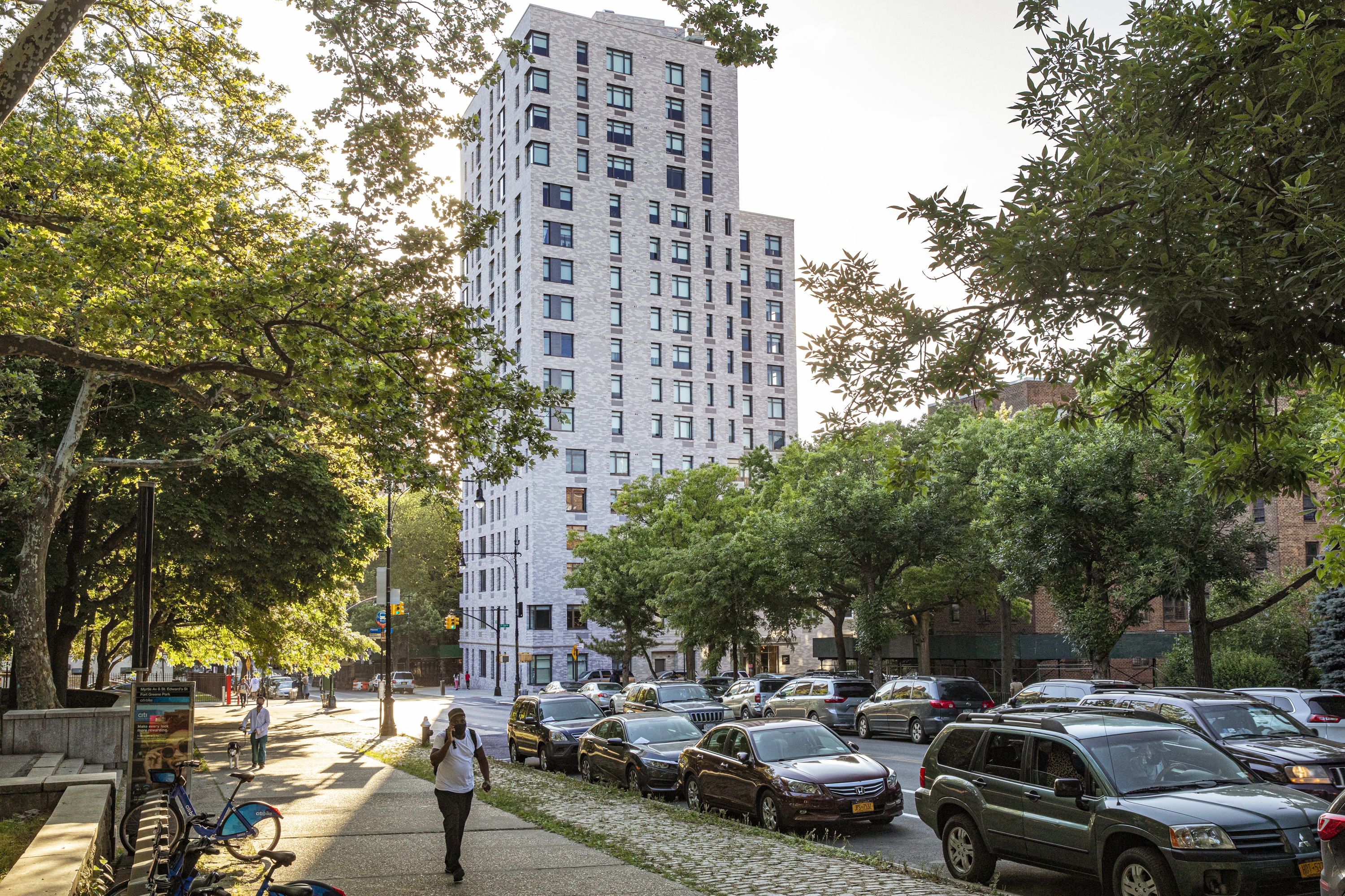 Stonewall House, occupying a prominent corner at Myrtle Avenue and St. Edwards Street in Fort Greene, stands as the largest LGBT-welcoming elder housing development in the country. Completed in 2019, this 17-story, mixed-use building spans 124,000 SF and includes 145 apartments and a 6,800 SF SAGE community facility on the ground floor. Brick, a key material and design element, anchors the building in its context, stepping down from the intersection via three setbacks to create common roof terraces. The project fosters community among residents and strengthens its connection to the neighborhood. Initiated by a NYCHA RFP, the building was conceived to create affordable, inclusive housing for seniors, helping relieve pressure on other NYCHA family units. Developed through a partnership between BFC Partners and SAGE, the project offers essential on-site services. The massing, articulated façade, and material selections respond to context and budget, while providing durable, accessible housing. Each unit includes aging-in-place features such as walk-in showers and accessible layouts. Mayoral overrides helped resolve zoning constraints, and the team prioritized healthy materials, daylighting, emergency preparedness, and water-efficient landscaping. Stonewall House stands as a vital model for affordable, community-centered housing.