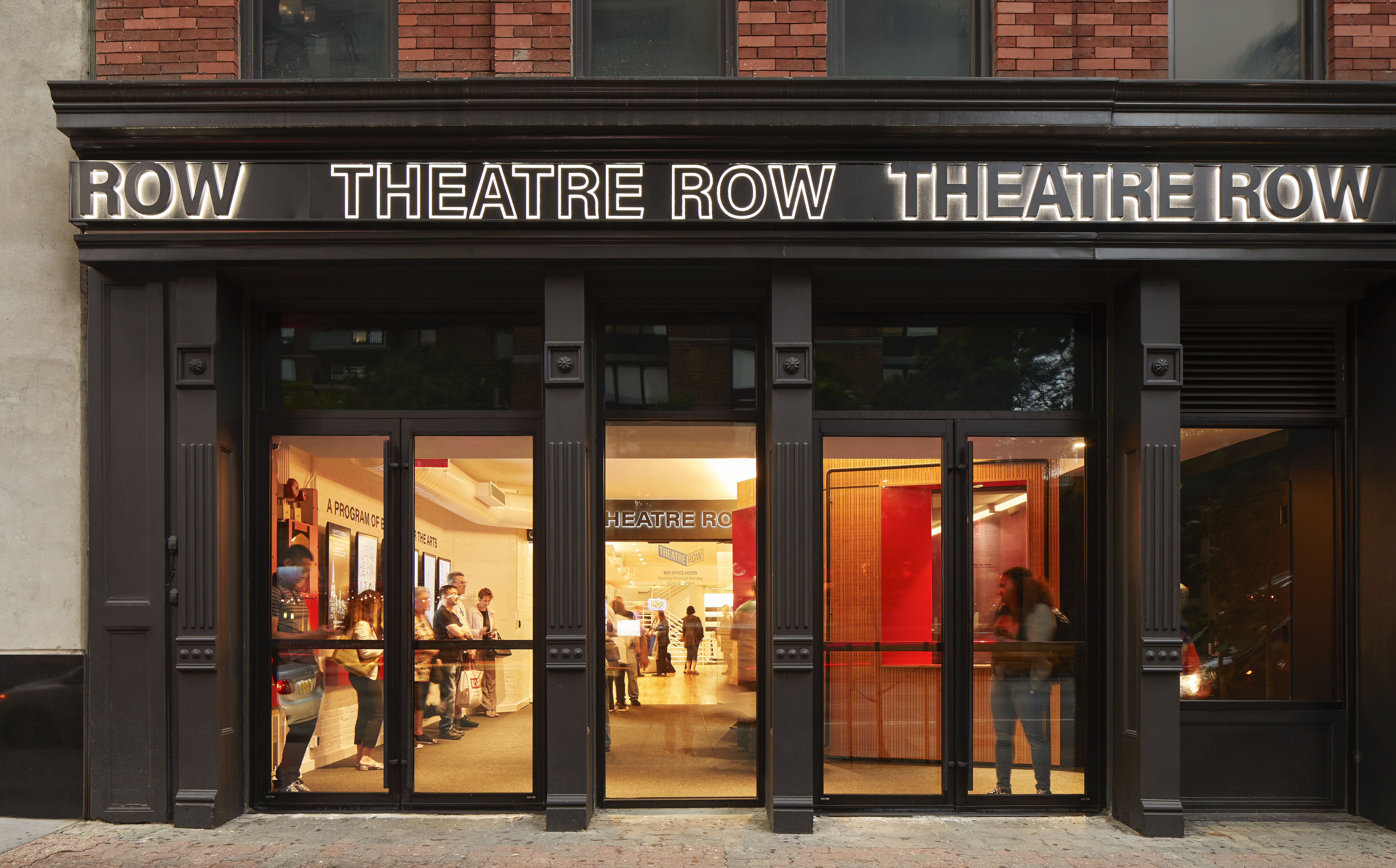 AO's with Theatre Row started with a concept design for the entire 45,000 square foot complex with the goals of expanding visibility on 42nd Street, creating cohesion throughout the fragmented building complex, and enhancing the experience within each of the five theaters. AO developed fully illustrated concept design options including one where the lobby and ground floor theatre “flip” locations to create a new theatre with optimal sightlines and a more generous lobby open to the lounge above. The realized first phase “Refresh” renovation consists of highly impactful, yet cost-effective, improvements to the exterior street face and interior public areas. New illuminated facade signs and glass entry doors enhance visibility on 42nd Street, while new finishes, lighting, millwork, signage, and furnishings throughout in the lobby, lounge, and main stair create a vibrant, welcoming experience for the artists and audience members. These targeted enhancements, built while the facility remained open, reflect the organization’s new artistic programs and diversity and inclusion initiatives.
